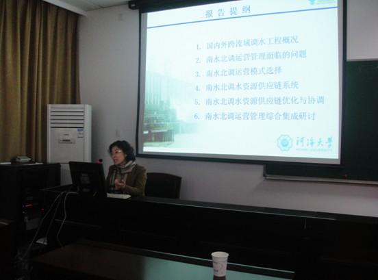 王慧敏教授的学术报告题目为“供应链管理在跨流域调水工程运营管理中的应用”。王教授从国内外跨流域调水工程概况、南水北调工程运营管理面临的问题、南水北调运营模式选择、南水北调水资源供应链系统、南水北调水资源供应链协调与优化以及南水北调运营的综合集成研讨等六个方面,详细阐述了供应链管理在南水北调工程中的具体应用问题。该学术报告进一步拓宽了男人天堂 师生从事供应链研究的思路,受到了与会师生的一致认同。学术报告在热烈的掌声中结束。