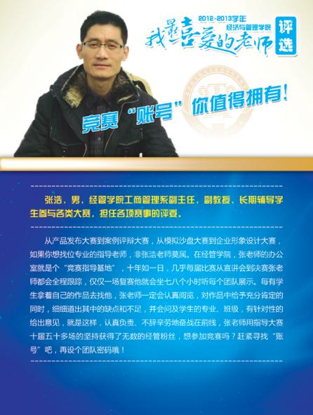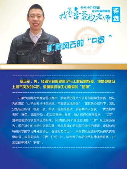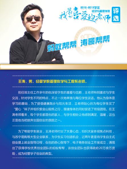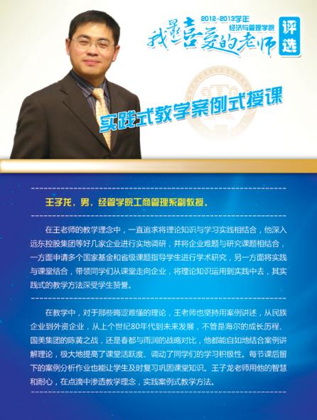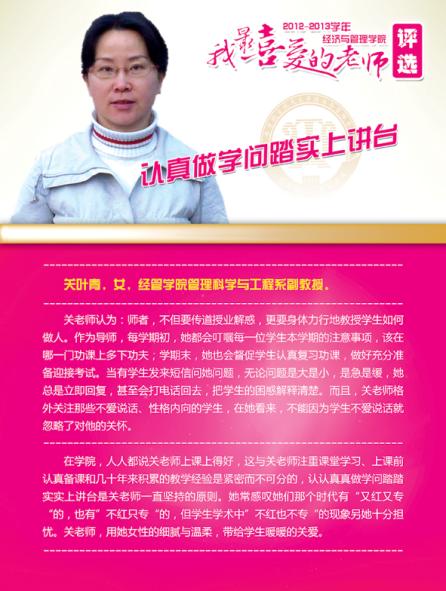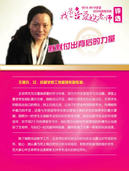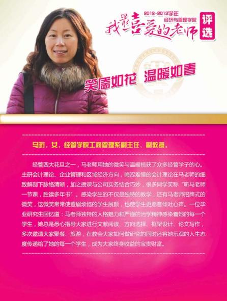 通过学院各系部及学生推荐评选,学院涌现出了一批深受学生喜爱的优秀教师,这些老师当中有认真做学问踏实上讲台的青年骨干,有实践式教学案例式授课的专业学者,有把程序写进生活的幽默大师,有竞赛场上意气风发的指导名师,有默默无言资助无数学生的“摇钱树”,有用文学演绎经济学之大美的系部中流砥柱,有指导学生自主式成功创业的帮帮老师,让我们走进这些老师,品读他们的感人事迹!