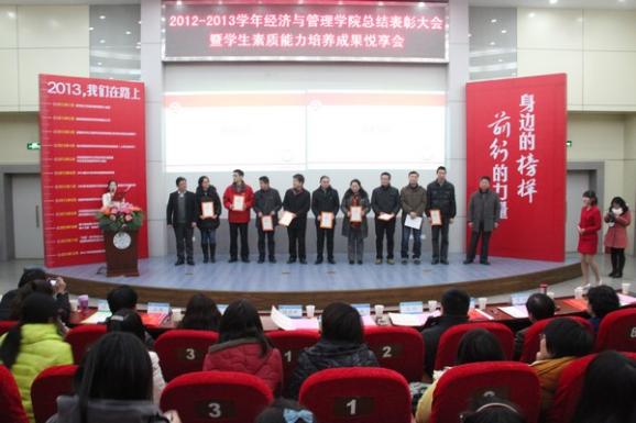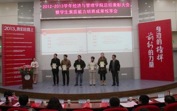 2012-2013学年“御商•致远”总结表彰大会暨学生素质能力培养成果悦享会于12月20日下午隆重召开。教务处副处长金科、校团委副书记王霄、研究生院教育管理处副处长管祎、学生处事务科科长张跃、经管院院长周德群、党委书记李遥、副院长张卓、党委副书记许静、学院办公室主任、团委书记、企业导师代表、本科生导师代表、班主任代表、辅导员以及四百多名经管学生参加,大会由工商管理系谢嗣胜老师和2012级本科生樊佳慧主持。