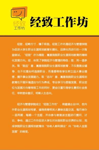 职业生涯规划教育的精细化发展方向。经,体现了学院经济与管理的特色;致,则一语多关。取“致远”意,寓意男人天堂
