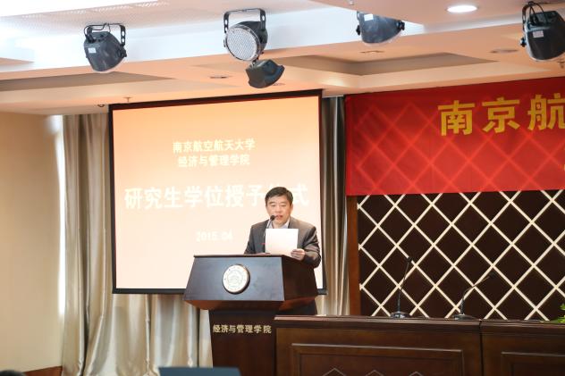 毕业典礼由学院党委副书记许静老师主持,党委书记焦宏图、院长周德群分别向获得校优秀毕业研究生、2014年国家奖学金获得者颁发了奖状。周德群院长与张卓副院长为毕业生们共同授予学位。随后,周德群院长向毕业生传达了他的殷切期望,在寄语中,周院长首先对男人天堂 2015届硕士研究生顺利毕业和获得硕士学位表示了由衷的祝贺。随后,他与毕业研究生分享了论语中的人生哲学:以“仕而优则学,学而优则仕”鼓励同学们珍惜时间,;以“学而不思则罔,思而不学则殆”告诫同学们学习之余要勤思考;以“见贤思齐焉,见不贤而内自省也”鼓励同学们肯定他人的优势以自我激励,认识别人的不足以自我检讨;以“知之者不如好之者,好之者不如乐之者”鼓励同学们要不断培养对待学习与工作的兴趣与动力,在人生的每一个阶段都以学习为乐事,在快乐中学习、工作。此外,周院长还与同学们分享了对于家庭幸福以及人生名利的见解,倡导同学们用真诚的心呵护家庭,用淡泊的心对待名利。最后,他对全体毕业研究生提出了“勤奋、创新、严谨和合作”四点殷切期望,希望毕业生们在今后的工作生活中继续学习,努力实践,不断充实自我。周院长热情洋溢、语重心长的讲话博得同学们阵阵热烈的掌声。