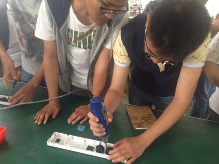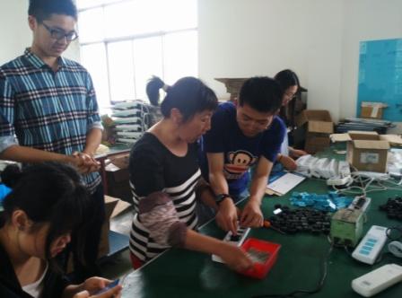 初到公司,工作人员为我们介绍了海锚公司的发展历程和主营产品,让我们对海锚公司有了初步的了解。而后,工作人员将我们带到了公司的一个小型生产车间,同学们一听说需要我们自己独立制作排插时,大家都跃跃欲试,万分期待自己的成果。在一位经验丰富的师傅为我们介绍了电源转换器排插外壳及内部组件的装配过程后,同学们两两一组,迅速投入到了排插的制作中,领料、组装、固定等等一系列动作,同学们有条不紊的进行。在一次次的操作过程中,同学们的操作变得越来越熟练,通过动作分析,装配效率明显提升。在之后的装配比赛中,同学们更是充分利用自己所学的特长,利用流水线生产、单个生产作业等多种方式装配生产,在大家的共同努力下,第一小组的5名成员通过流水线作业的方式在6分20秒的时间内生产出了27件产品,公司的员工说,这一成绩甚至优于公司的大部分熟练工的生产效率。
