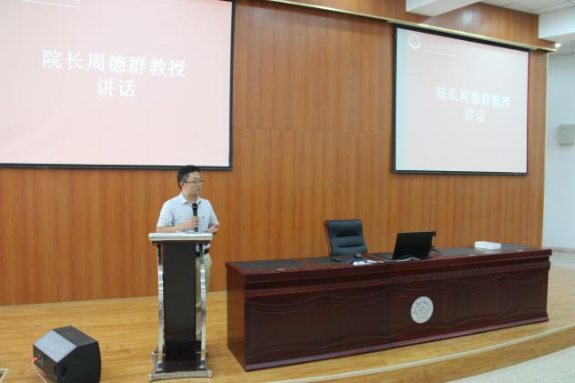 在院长致辞中,周德群首先通过早晨纪念抗战胜利70周年的大阅兵,引发大家对于中国梦和大学理想的思考,并抛出“大学学什么”的话题。接着,他提出利用四年美好的青春年华来上大学,是件意义重大的事。在这四年里,同学们首先要学会培养正确的价值观,积极投身社会公益活动;其次要保证自己的身心健康,积极转变思维模式;此外,要学会重新审视自己,不断反省自身不足;再者,要多与教师同学交流,从观念不同的人群身上汲取新知;永远不可舍弃思考,要在不断的思维训练中增强洞察力,判断力,进而探索自身的无限可能。