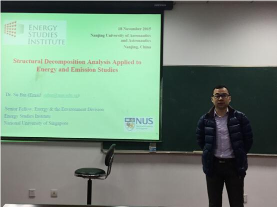 交流并做了主题为“Structural Decomposition Analysis Applied to Energy and Emission Studies”的专题讲座。 讲座中苏斌分析了结构分解分析和指标分解分析两种方法的区别,并介绍了结构分解分析方法在能源经济和排放研究领域的主要应用情况。专题讲座结束后,在场师生和苏斌针对目前国际能源和排放问题研究领域中结构分解分析及其他研究方法进行了讨论。 据了解,苏斌主要研究领域为能源经济与政策、能源与气候变化、能源环境系统建模和分析。现任 Energy Economics (SSCI源刊) 期刊副主编,Reports on Economics and Finance 期刊编委,以及 30 多个国际期刊审稿人,包括 Nature Climate Change, Proceedings of the National Academy of Science of the United States of America, Energy Economics, Energy Policy, Ecological Economics, Applied Energy, Economic Systems Research 等。在国际期刊 Energy Economics, Ecological Economics, Energy Policy, Energy, Applied Energy, Economic Systems Research 等上发表 20 多篇能源和环境相关的文章。目前在新加坡能源研究所主持和参与多项能源环境相关的国内和国际合作研究项目,项目报告提交至新加坡环境与水资源部、贸易与工业部、外交部、气候变化秘书处、国家研究基金会等多个政府部门。 报告结束后,师生们踊跃发言和提问,就报告内容进行了详细探讨,报告会在热烈的讨论中圆满结束。