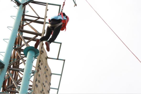 空中单杠锤炼了队员的胆量和勇气,同学们需要爬上天梯,在最高处跳跃抓住空中的单杠,在教练和导员的见证下,在一声声或害怕或刺激的尖叫中,同学们突破了自己,变得更加勇敢。