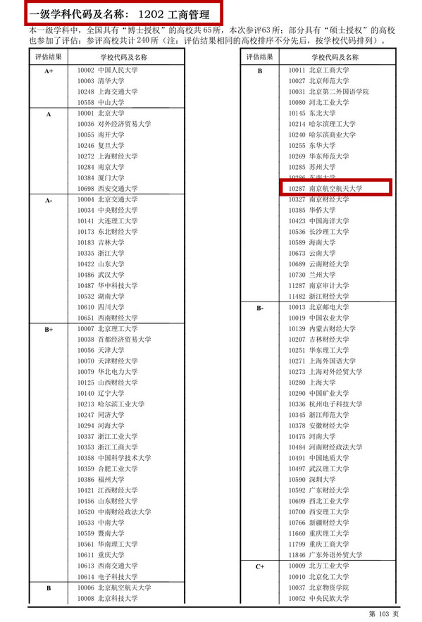 管理科学与工程学科再度攀升,进入全国A-档行列,排位全国前5.3%,进入前10,与力学、机械工程一起成为南航进入A-档“三甲”,工商管理学科也突破性地进入全国B档行列,排位全国前20%,进入前50。其中管理科学与工程学科参评高校共计187所(博士授权高校85所),工商管理学科参评高校多达240所(博士授权高校63所)。