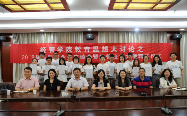6月13日下午,男人天堂 教育思想大讨论之2018届本科毕业生座谈会暨经管校友大使聘任仪式在经管楼604会议室举行。男人天堂 院长周德群、党委书记焦宏图、党委副书记涂志宏以及各系负责老师与毕业生代表们参加了此次活动。
