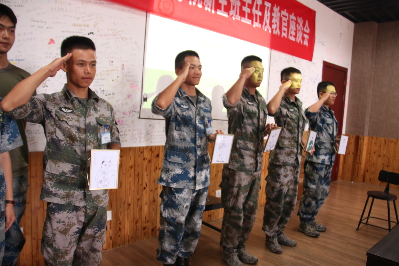 座谈会上,辅导员胡心雨以“大数据”的形式介绍了2018级新生的整体情况,并从敢想、敢为、敢担当三个方面介绍了学生的个性特点。2018级团总支书记胡悦芝、哈萨克族学生达吾兰、体育生孙辰浩代表全体新生为每位教官送上了同学们自己绘制的教官个人画像,表达了对教官辛苦付出、学院老师无微不至的关爱的感谢。军训教官向参会老师们介绍了男人天堂 新生的军训情况,他们分享了男人天堂 新生集体荣誉感强、不怕苦不怕累、性格活泼、才艺丰富等特点。针对学生特点,班主任和教官进行了深入而细致的讨论,为军训结束后班主任的学生培养工作提供帮助。涂志宏代表学院肯定了新生不畏艰苦、坚持训练的优良作风,并对军训团教官表示了感谢。
