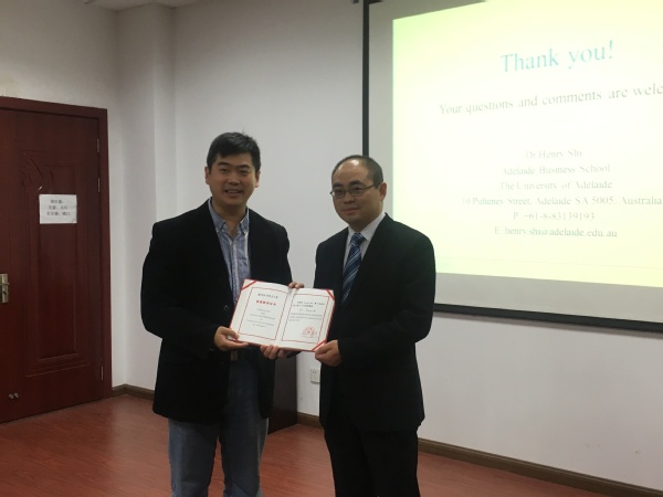 受聘仪式中,王子龙副院长为施翔教授颁发了荣誉证书,向参会嘉宾及师生介绍了施翔教授的学术经历和学术成就,并感谢施翔教授对我校的帮助与指导,希望施教授受聘我校客座教授后,两校能进一步加强国际学术交流,拓宽科研合作领域,联合培养优秀人才。