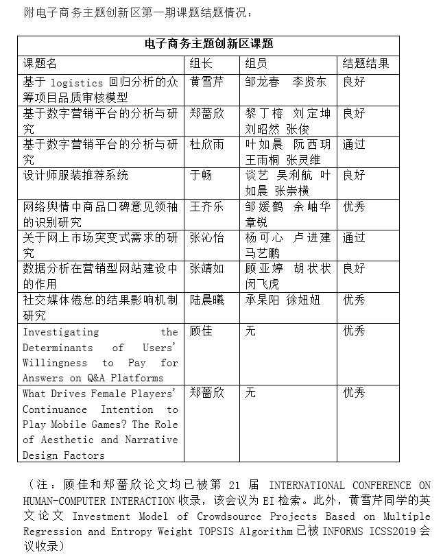 在过去的一年中,EC创新工作室积极组织多场研究进度汇报会,跟踪各队伍的进展情况,各团队也积极参与、交流。18年11月份,EC创新工作室举办了电子商务主题创新区的中期审核会,九支队伍及学院、企业导师出席,指导老师们对课题团队后半程的研究计划提供了建议方向。中期审核会后,保留了进度合理、中期成果显著的队伍继续主题创新区课题,有的队伍则对研究进行了延展;此外,创新区课题还吸引了新同学顾佳的加入,形成了有价值的论文。