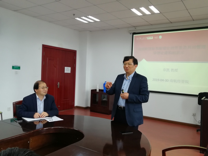 2019年4月30日上午,中国人民大学商学院章凯教授应男人天堂 人力资源管理研究所的邀请,在学院702会议室作了题为“自组织目标系统理论的开发及其对管理学理论建构的启示”的学术报告。报告由胡恩华教授主持,东南大学经济管理学院的吕鸿江教授、男人天堂 的张龙教授、王凌云副教授等老师和研究生参加了本次学术讲座。