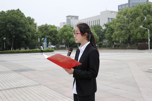 升旗完成后,18级团总支书记胡悦芝作为年级代表在国旗下讲话。“百年前五四运动以全民族的力量高举起爱国主义的伟大旗帜,孕育了以爱国、进步、民主、科学为主要内容的伟大五四精神,不忘初心,方得始终”。她从铭记光辉历史、展现青春风采、争做时代新人三个方面,号召同学们把握青春韶华,谨记“尚德励学,筹策济世”的经管院训,内化于心,外化于行,知行合一,接过先辈的火炬,弘扬五四精神。