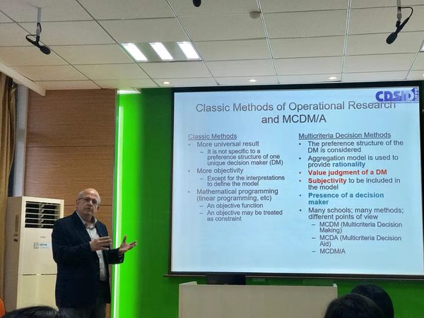 Adiel Teixeira de Almeida详细介绍了建立决策模型框架的过程,调动了在场师生对多准则决策模型的框架的兴趣,大家就框架构建的要素、构建的方法等问题与Adiel Teixeira de Almeida进行了互动交流。活动结束后,大家仍意犹未尽,争相与Adiel Teixeira de Almeida进行了合影留念。
