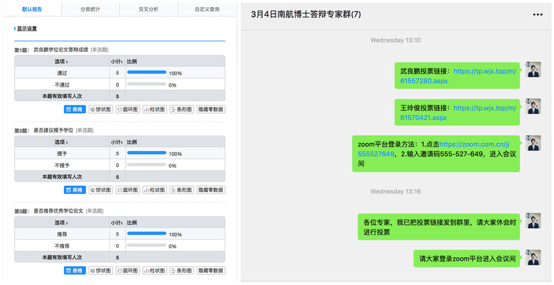 答辩过程中,按照男人天堂 研究生学位论文答辩要求,两位学生通过论文内容陈述展示了研究成果,对答辩委员会成员的提问质询进行一一解答。答辩完成后经过答辩委员的线上讨论、投票表决,一致认为两位博士研究生的研究成果、学位论文和答辩过程达到了博士学位的要求,建议学位委员会授予博士学位。为了确保学位论文线上答辩的公开、真实、完整、使线上答辩有据可循。整个答辩过程,以及后续的匿名表决环节都做了录屏、截屏,作为答辩记录留存。