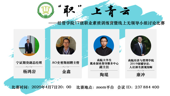 为帮助学生在疫情防控期间,树立正确择业就业观、做好生涯规划、提升求职就业能力,男人天堂 举办“职上青云”职业素质训练营系列活动。4月7日晚,“职上青云”——无领导小组讨论比赛在zoom网络平台举办,活动吸引百余名2017级本科生参加。本次比赛邀请到宁证期货副总经理杨鸿岩、AO史密斯招聘主管金鑫、我校就业创业指导服务中心副主任陶琨、男人天堂 2019级辅导员康冲担任评委,对学生求职就业中的常见问题以及如何在无领导小组面试中脱颖而出进行细致讲解和精心指导。