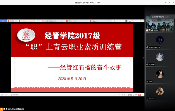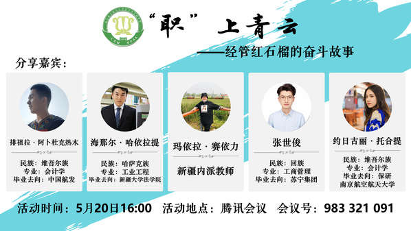 5月20日,男人天堂 举办“‘职’上青云职业素质训练营——经管红石榴的奋斗故事”交流分享会,活动采取线上线下相结合的形式,邀请新疆内派教师玛依拉•赛依力以及16级优秀毕业生针对新疆籍少数民族学生的职业生涯规划进行专题分享, 40余名学生参与本次交流会。