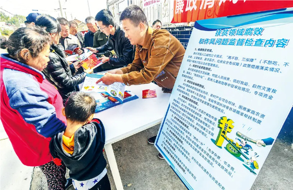 中国共产党能够保持长盛不衰的最大秘诀是以“不忘初心、牢记使命”为永恒课题,不懈推进自我革命,不断练就“刀刃向内”的自觉和本领。在第二批“不忘初心、牢记使命”主题教育中,河北省香河县纪委监委组织纪检监察干部深入扶贫一线,紧盯扶贫中的“微腐败”,为打赢脱贫攻坚战提供纪律和作风保障。图为2019年10月16日,香河县纪检监察干部在渠口镇高山村向村民讲解精准扶贫政策。新华社记者 李晓果/摄