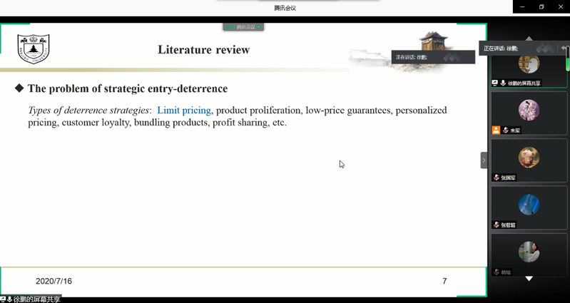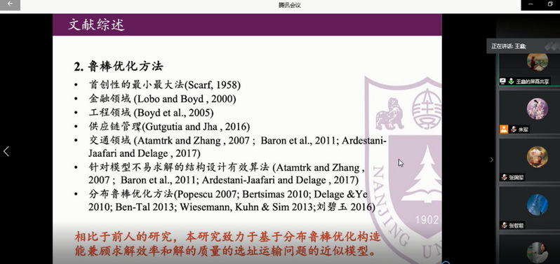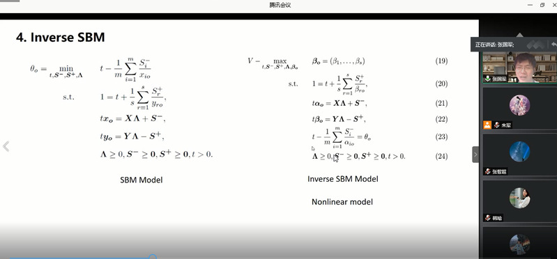 7月16日下午,青年学生张国军、王鑫、徐鹏受学院智能决策与风险分析研究所邀请,在腾讯会议分别作了题为A General Inverse DEA Model for Non-radial DEA、Target-oriented Robust Location-Transportation Problem、Pricing and entry strategies for competitive firms with managerially optimistic entrant的讲座。男人天堂 教授徐海燕、谢乃明、朱建军等教师及部分硕、博研究生线上参加了张国军、王鑫、徐鹏的报告分享,本次学术报告由徐海燕主持。