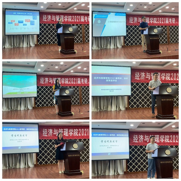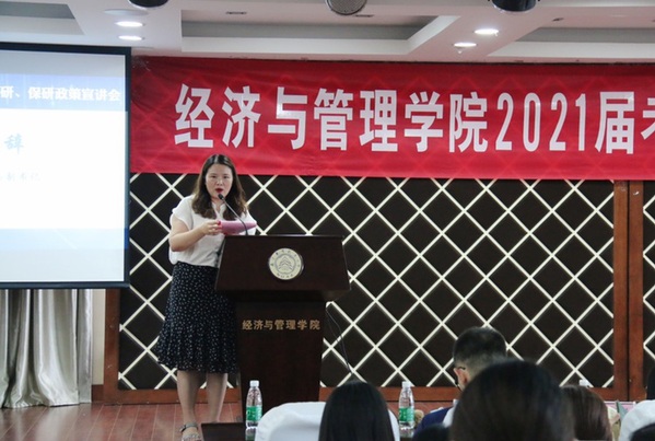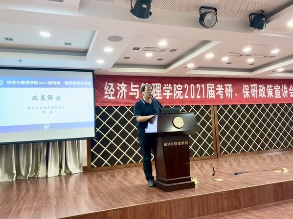 为了帮助2021届毕业生了解男人天堂 研究生招生政策,合理规划考研、保研目标,提升学院生源质量,8月27日,男人天堂 在A0305报告厅开展2021届考研、保研政策宣讲会。男人天堂 副院长邓晶、谢乃明,党委副书记涂志宏,管工系系主任马静、副主任虞先玉,工商系副主任刘文龙,经济系副主任查冬兰,辅导员及百余名2017级学生参加了本次活动。