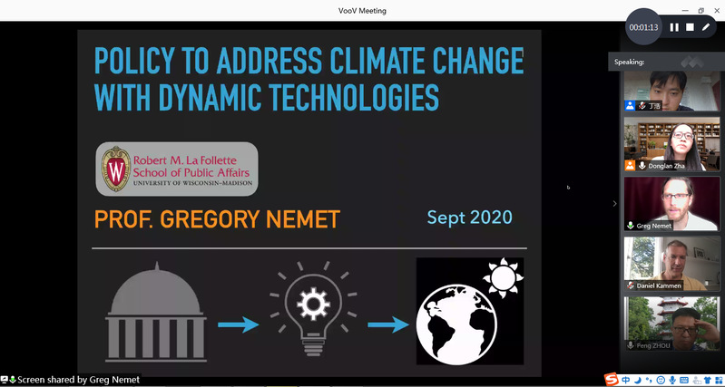 在此次学术交流活动中,Nemet首先作了题为‘Policy to address climate change with dynamic technologies’的报告。Nemet表达了对习近平总书记于2020年9月22日在联合国大会上提出的中国到2060年实现碳中和的目标的兴奋之情。在此基础上,Nemet重点介绍了动态技术变化过程以及动态技术变化系统,以及在碳中和目标实现过程中的政策需求。