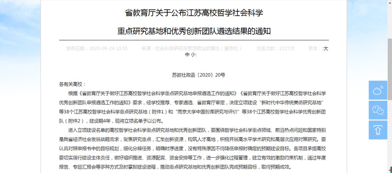据悉,江苏高校哲学社会科学创新团队每2年组织遴选一次,经学校推荐、专家遴选、省教育厅审定等环节后确定立项建设,并由省教育厅和所在高校共同管理,建设周期为4年。2020年,全省共立项创新团队38个。