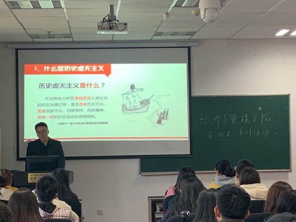 最后,他指出历史虚无主义本质是形而上学的唯心史观,并向同学们提出了抵御历史虚无主义冲击的三条建议。第一,站稳人民立场。他以解放战争时期的三大战役和今年的抗击新冠肺炎疫情阻击战为例,阐述了历史唯物主义的群众史观——人民是历史的创造者;第二,运用历史唯物主义方法。结合当时的时代背景,全面、长远、辩证的分析问题。第三,以史为鉴。历史是最好的教科书、最好的清醒剂,应该在尊重历史的基础上,弘扬伟大的抗美援朝精神,为实现中华民族伟大复兴的中国梦不懈奋斗。