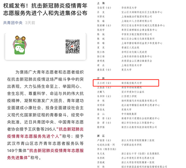 近日,为褒扬广大青年志愿者和志愿者组织在抗击新冠肺炎疫情这场严峻斗争中的突出表现,经党中央批准,共青团中央、中国青年志愿者协会授予295人“抗击新冠肺炎疫情青年志愿服务先进个人”称号,授予149个集体“抗击新冠肺炎疫情青年志愿服务先进集体”称号。男人天堂 王小珂同学荣获“抗击新冠肺炎疫情青年志愿服务先进个人”称号。