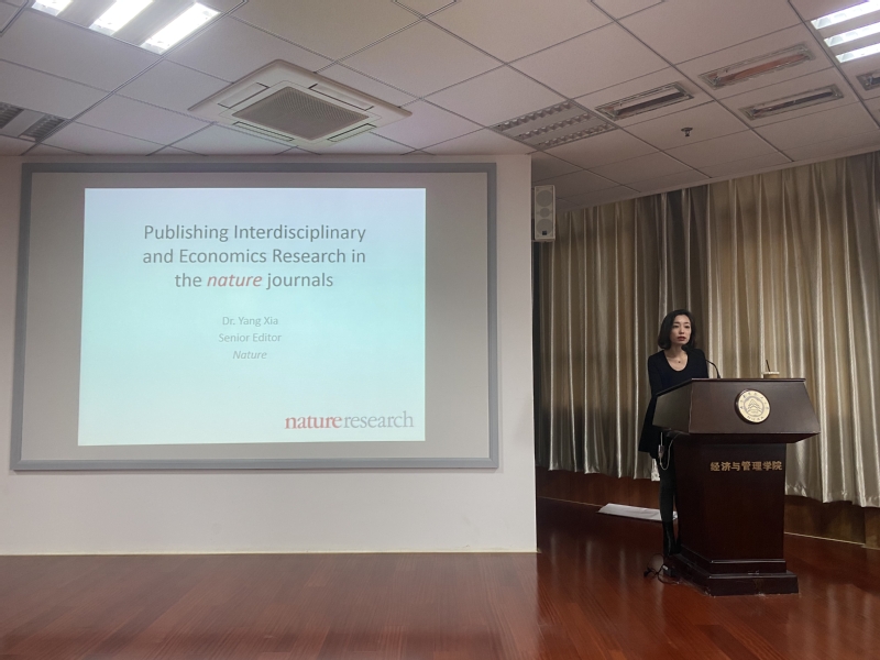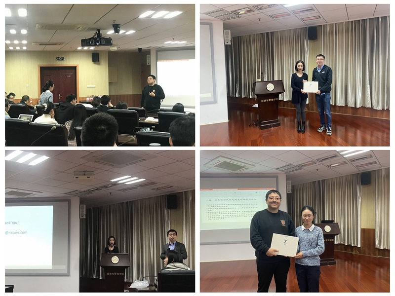 《自然》杂志高级学术编辑夏玚首先为大家作了题为《<自然>及子刊的交叉研究与写作发文技巧》的报告。夏玚详细介绍了《自然》系列杂志的设计架构、文章标准和审稿流程。夏玚作为《自然》杂志社会科学领域的唯一编辑,生动详实地为现场师生讲述了《自然》系列杂志多学科交叉的特点,以及所接收文章的选题范围。夏玚以自身实际工作经验对文章投稿全流程阶段所需工作提出了具体的建议,针对文章布局、介绍信、回复信的写作要点给出了点对点的指导。