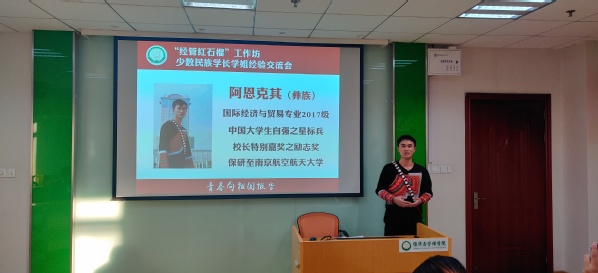 国家奖学金获得者、已保送至北京交通大学的苗族学生傅歆芮从课程学习、学生工作、科研竞赛、志愿实践等方面向学弟学妹们给出了意见和建议。中国大学生自强之星标兵、彝族学生阿恩克其则从自己的成长历程出发,向学弟学妹们讲述了自己十余年来的求学经历,“受助、自助、助人”的故事触动和勉励着在场的所有同学。