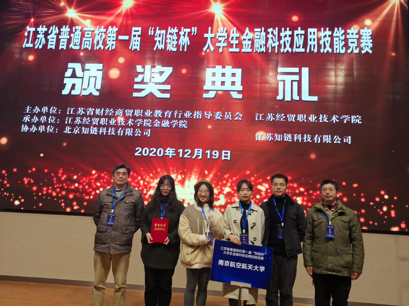 2020年12月19日,江苏省普通高校第一届“知链杯”大学生金融科技应用技能竞赛在江苏经贸职业技术学院举办,本次竞赛由江苏省高等教育学会认定,江苏省教育厅委托江苏省财经商贸职业教育行业指导委员会主办,南航、河海、南农等省内50余院校60团队300师生参赛。通过激烈地角逐,男人天堂 代表队获得了本次大赛的本科组团体一等奖。