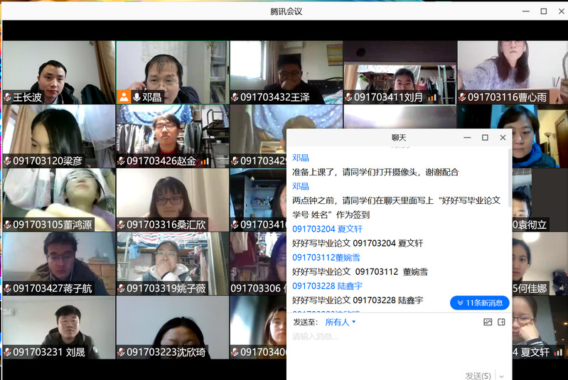 为保证线上教学的有序开展,学院教学办提前对前两周需开展线上教学的课程进行了信息统计,并对相关教师和同学进行了提前动员,明确了相关要求。如进入线上课堂后,学生需注明学号姓名等信息,人数不超过两个自然班的线上课程学生需打开摄像头;鼓励教师充分使用会议聊天工具或QQ、微信群与同学互通信息,活跃课堂氛围;并通过完善PPT的教学素材及呈现模式,提升线上课程的教学效果。