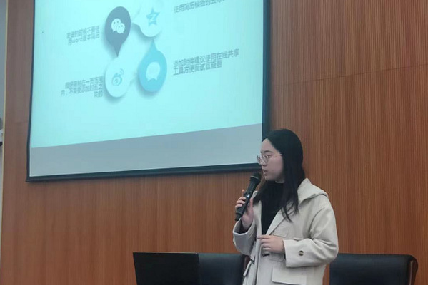 最后,2017级学生王喜喜也应邀针对如何寻找实习信息以及简历投递注意事项等方面进行主题分享。