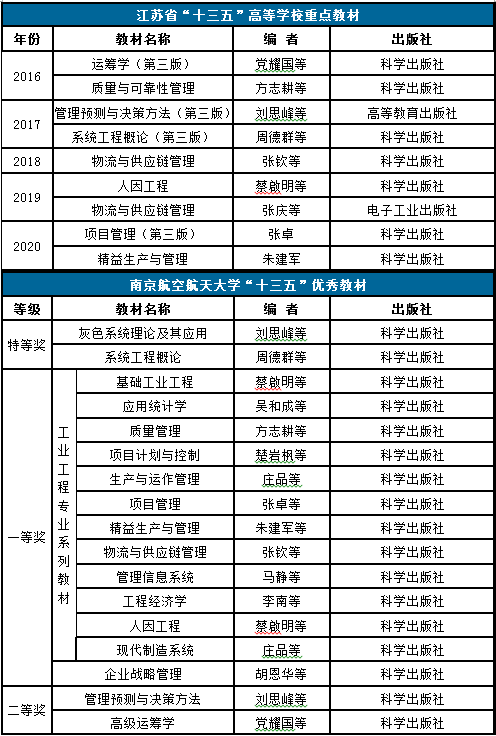获特等奖2项(《灰色系统理论及其应用》、《系统工程概论》),占全校特等奖总数的50%;一等奖2项(《工业工程专业系列教材》共12部、《企业战略管理》),二等奖2项(《高级运筹学》、《管理预测与决策方法》),获奖数量及层次居全校前列。