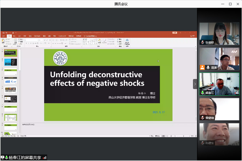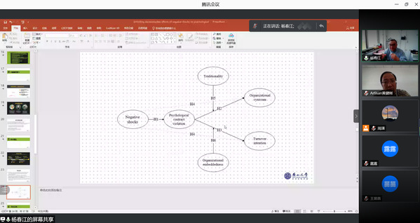 5月17日,燕山大学经济管理学院教授杨春江应男人天堂 人力资源管理研究所和江苏省人力资源发展研究基地的邀请,在线上作了题为“消极震撼事件的影响及机理研究——基于服务业一线员工的调查”的精彩学术报告。本次报告由教授胡恩华主持,年轻教师、博士生和硕士生参加了此次学术报告活动。