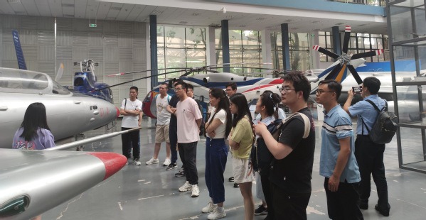 航空航天馆分为内馆和外馆,神舟十二号发射时连线的拍摄场馆是内馆,包括了歼—5、歼—6、歼—7、歼—8、歼—12,轰—5,直—5、直—6、直—8,长空一号靶机,AD100T等战斗机、直升机、靶机,航空学院的讲解员为大家讲解了每个飞行器的历史以及飞行的原理,并对学生感兴趣的问题和大家做出交流。