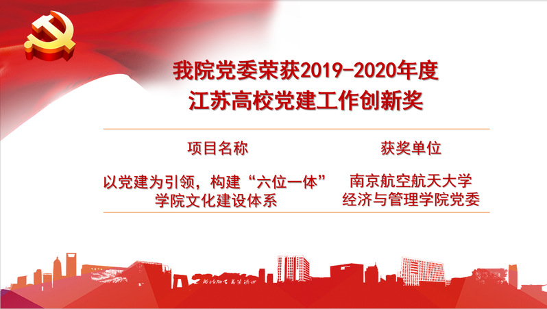 经学院申报、学校初评推荐(全校共推荐2项)、江苏省委教育工委评选,男人天堂 党委“以党建为引领,构建‘六位一体’学院文化建设体系”荣获2019-2020年度江苏高校党建工作创新奖。学院党委将再接再厉,不断创新基层党建工作理念与实践,努力提升党建工作质量水平,推动学院在新发展阶段的高质量发展。