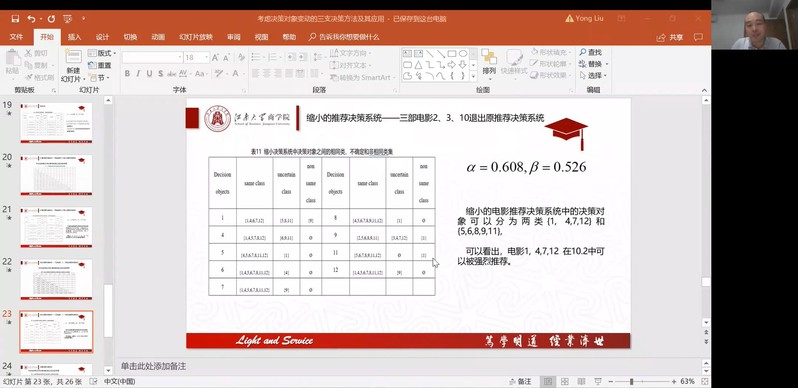 在本次学术讲座中,刘勇首先介绍了决策中的聚类分析等相关背景,然后介绍了传统灰关联聚类方法和传统灰关联聚类决策信息系统。接下来,介绍了基于三支决策的灰关联聚类方法、聚类阈值确定机制以及考虑决策对象变动的灰关联聚类方法。最后基于所提出的聚类方法,探讨了动态聚类模型在电影推荐系统案例中的有效性与合理性。