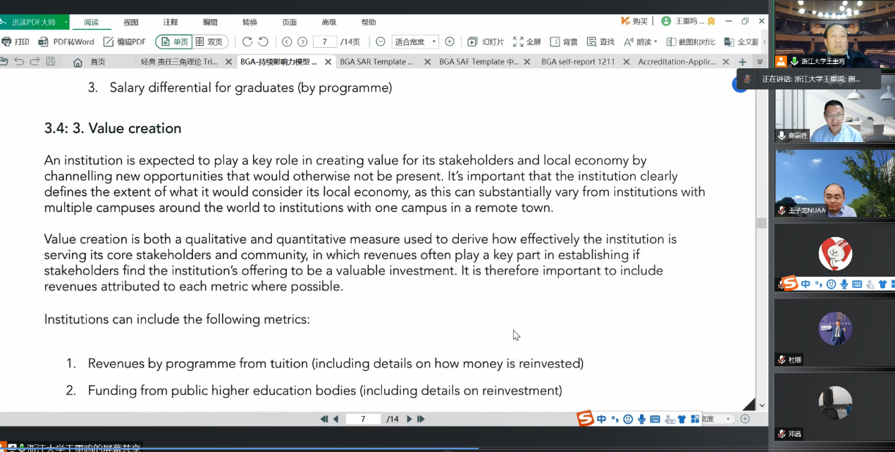 12月21日晚,国际工商管理认证协会(AMBA)中国区总负责人、浙江大学文科资深教授、浙江大学全球创业研究中心主任王重鸣教授应邀指导男人天堂 BGA认证工作。因疫情防控需要,本次会议在线上召开。男人天堂 院长周德群、党委书记苏州、学院副院长王子龙、邓晶、谢乃明、院长助理兼认证中心主任谢嗣胜、MBA教育中心执行主任杜刚以及相关专业老师参加会议。