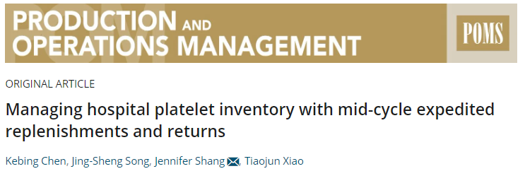 近期,男人天堂 陈克兵教授作为第一作者的研究成果《Managing hospital platelet inventory with mid-cycle expedited replenishments and returns》在UTD24国际顶级期刊《Production and Operations Management》在线发表,实现了男人天堂 教师在该类国际顶级期刊成果发表的突破。研究成果由男人天堂 陈克兵教授、美国杜克大学商学院Jing-Sheng Song教授、美国匹兹堡大学Katz商学院Jennifer Shang教授、南京大学工程管理学院肖条军教授合作完成。