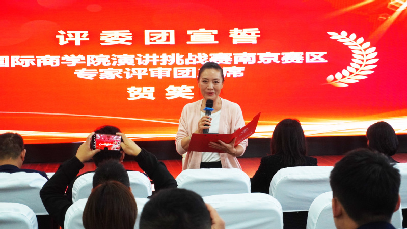 △南京赛区决赛现场,评审团成员贺笑女士代表评审团宣誓。
