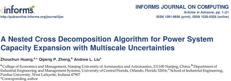近日,男人天堂 青年教师黄周春作为第一作者在UTD24国际顶级期刊《INFORMS Journal on Computing》上在线发表了题为《A Nested Cross Decomposition Algorithm for Power System Capacity Expansion with Multiscale Uncertainties》的学术论文。该论文由男人天堂 教师黄周春、美国中佛罗里达大学工业工程系Qipeng Phil Zheng副教授、美国普渡大学工业工程系Andrew Liu副教授合作完成。