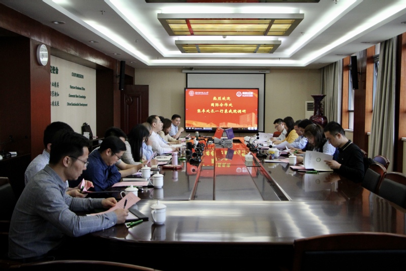 5月18日国际合作处处长张卓、副处长张国权、沈敏、综合事务科科长祖语嫣、国际合作项目科科长田立丰、出入境服务中心主任董峰来男人天堂 调研座谈。男人天堂 党委书记苏州、院长周德群、院党委副书记胡苹、副院长王子龙、谢乃明、查冬兰、院长助理蒋昕嘉、欧阳林寒、管工系系副主任达高峰、工商系赵亚普副教授、院国际合作事务秘书许志卓参加了此次调研。