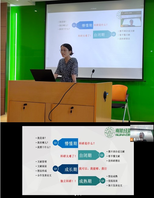 活动上半场,孔茜茜以“从心出发,毅起研究”为主题进行了经验分享。她指出研究生在探索科学问题的道路上一般要经历懵懂期、自闭期、成长期和成熟期这四个阶段,并基于自身研究博弈论的相关经验,分享了应对各阶段困境的一些小妙招。