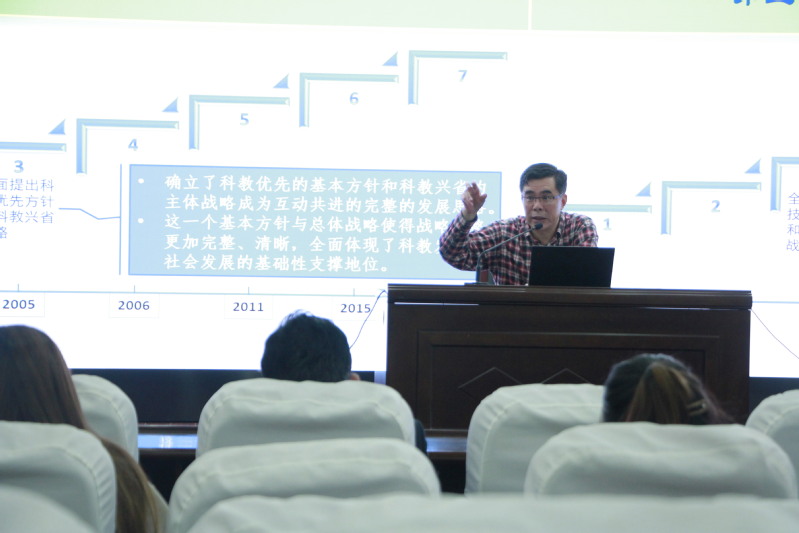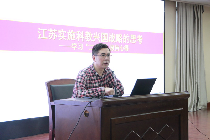 随后,吴宏为学院师生作题为《江苏实施科教兴国战略的思考》主旨报告,深入解读阐释党的二十大报告关于“实施科教兴国,强化现代化建设人才支撑”内容,以“三个主题”、“三个第一”、“三个战略”、“四个新”凝练概括,基于江苏发展历程,从“科技创新是江苏经济社会发展的内在要求”“江苏省科教兴省的主要内容”“影响科技创新的基础问题和未来实施科教兴国的方向”等四个方面进行交流分享。