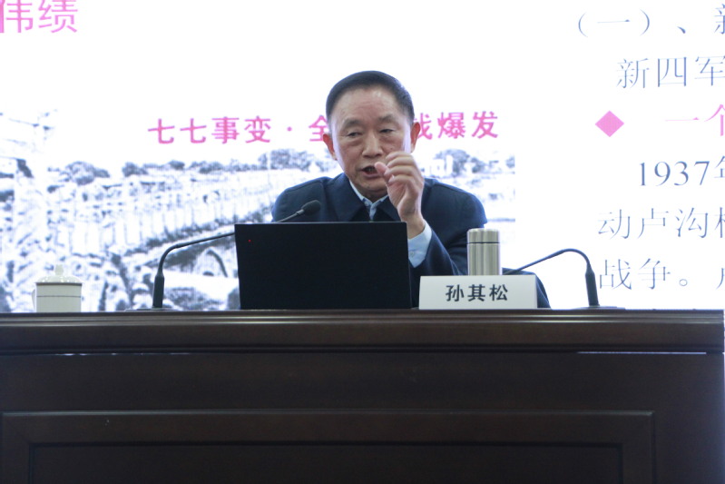 报告前,孙其松对母校的蓬勃发展表达了内心的自豪与美好的展望。在专题报告中,孙其松围绕新四军的发展历程、铁军精神的内涵、新时代优秀大学生如何弘扬铁军精神三个方面展开报告,生动讲述了新四军在抗日战争、解放战争中的丰功伟绩,全方位展现了新四军听从指挥、忠于人民,敢打敢拼、英勇善战的铁军精神和英雄气概。