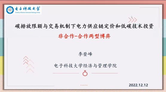 12月12日下午,长江学者特聘教授、电子科技大学男人天堂 李登峰教授受学院智能决策与风险分析研究所邀请,在腾讯会议作题为“碳排放限额与交易机制下电力供应链定价和低碳技术投资非合作-合作两型博弈”的学术讲座。男人天堂 教授徐海燕、副教授高广鑫等教师及部分硕、博研究生线上参加了李教授的报告分享,本次学术报告由徐海燕主持。
