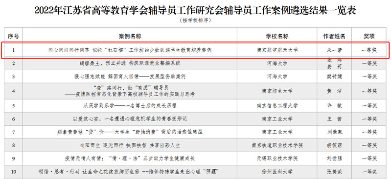 近日,江苏省高等教育学会辅导员工作研究委员会公布了2022年度辅导员工作案例遴选结果,男人天堂 辅导员朱一豪撰写的《同心同向同行同享 依托“红石榴”工作坊的少数民族学生教育培养案例》荣获江苏省辅导员工作案例评选一等奖。