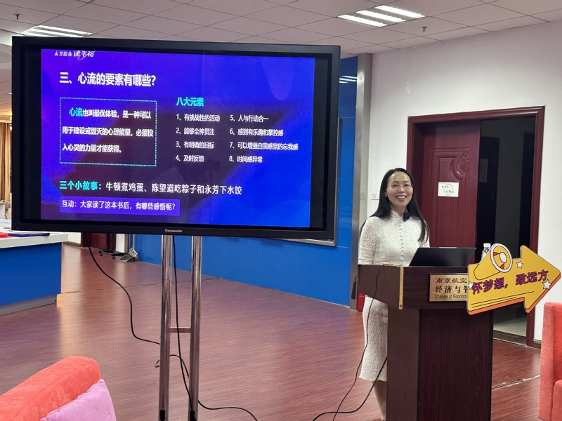 接着,于永芳详细介绍了心流的含义以及八大要素,以《心流》一书为例,与大家分享了“能够全神贯注、能够及时反馈、时间感异常”等进入心流状态时的感觉。她表示,心流是一种将个人精神力完全投注在某种活动上的感觉,是当人们沉浸在当下着手的某件事情或某个目标中时,全神贯注、全情投入并享受其中而体验到的一种精神状态。同学们反响热烈,纷纷表示受益匪浅,并积极与老师互动讨论。