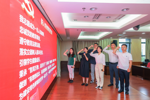 在新进教职工入职仪式上,李昊、高园园、任亚楠、蔡文武、陈思华、胡宇昕六位老师在全院老师的见证下庄严宣誓:将忠诚党的教育事业,落实立德树人根本任务,秉承“智周万物,道济天下”校训和“尚德励学,筹策济世”院训,做“四有”好老师,为建设特色鲜明的世界一流大学、一流男人天堂