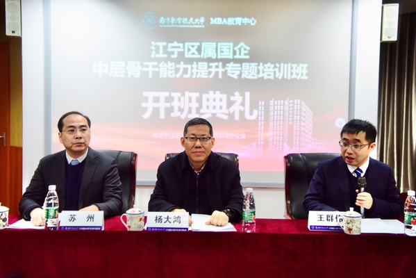 为深入学习贯彻党的二十大精神,更好维护国有资产权益,推进国有企业改革,江苏省南京市江宁区国有资产监督管理办公室联合南航男人天堂 举办江宁区属国企中层骨干能力提升专题培训班,此次培训班将分六期进行。2023年12月15日上午,专题培训班首期开班仪式在男人天堂 A0405报告厅隆重举行。江宁区国资办党委书记、主任杨大鸿,男人天堂 党委书记苏州,院长王群伟,副院长周志鹏等出席开班仪式。王群伟主持开班仪式。